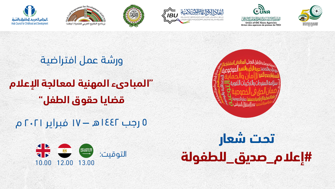 تحت شعار "إعلام صديق للطفولة" وبالتعاون بين المجلس العربي للطفولة والتنمية واتحاد وكالات أنباء دول منظمة التعاون الإسلامي (يونا) عقدت يوم 17 فبراير 2021، ورشة عمل "المبادئ المهنية لمعالجة الإعلام قضايا حقوق الطفل"، وذلك عبر تقنية الزووم، بهدف تنمية مهارات الإعلاميين في وكالات الأنباء والإذاعات والقنوات الفضائية والمنصات الالكترونية، ومؤسسات منظمة التعاون الإسلامي، حول المبادئ المهنية التي يجب مراعاتها عند معالجة قضايا حقوق الطفل إعلامياً وكيفية تطبيقها، وبمشاركة أكثر من 90 إعلاميا من مختلف دول العالم العربي والإسلامي.