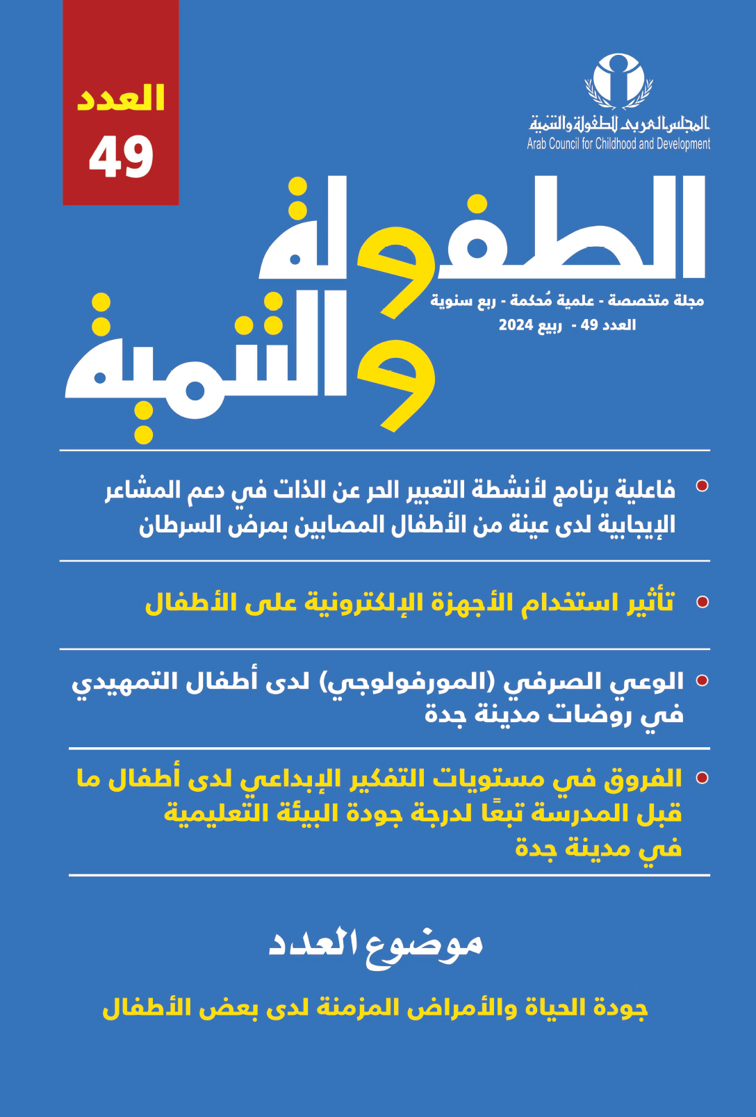 شمل العدد (49) من مجلة الطفولة والتنمية (مجلة علمية - متخصصة - محكمة)، عددا من الموضوعات التي تنوعت ما بين الدراسات والبحوث والمقالات، بالإضافة إلى موضوع العدد حول جودة الحياة والأمراض المزمنة لدى بعض الأطفال".